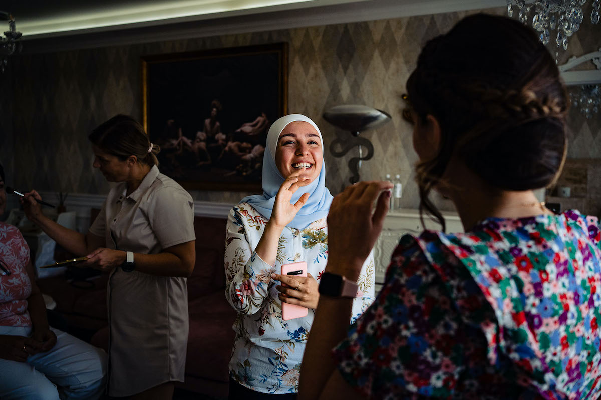 I started the day with the ladies getting ready. I consider myself as a documentary photographer in the first place. So therefore I always advise my couple to enjoy the day and do not fuss themselves about how to move or pose or do any awkward cheesy poses. Just celebrate the day surrounded by the most important people of their life – the family and the friends. I can definitely say that Eszti and Abed completely accomplished the task. After the ladies I photographed the groom’s preparation and we also made some portraits. After a short gathering of the families and friends we continued with the ceremonies which had some really touching moments. The ceremony was followed by gratulations and some small group shots. Before dinner we had almost one hour for taking some nice portraits in the beautiful end summer sunset. After the dinner the party began with Hungarian and Syrian music. Such a nice experience with open-hearted people. I loved every moment of the day.