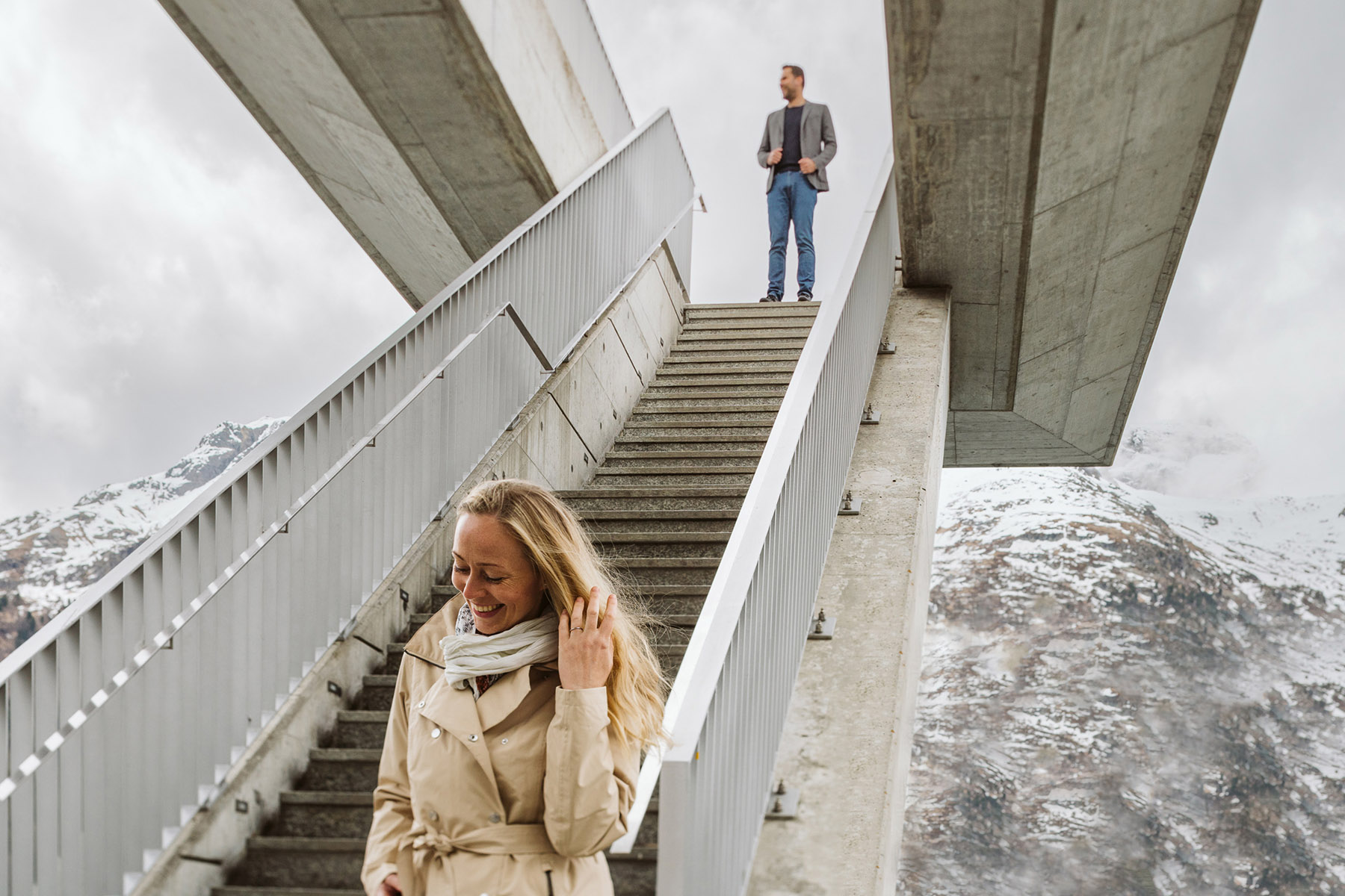 A Spectacular Vantage Point For a change of scenery. We ascended the Julierpass and were rewarded with a panoramic view that seemed to stretch forever. Perched high above the clouds, we discovered the Julierpass Red Tower, an astonishing landmark. Against the backdrop of cloudy skies and rolling hills, Évi and Atti embraced, capturing the essence of their love from this unique vantage point. The red tower added a touch of color to the photographs.