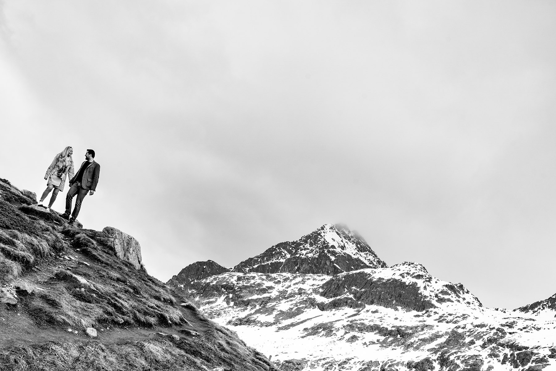 A Delight for Nature Enthusiasts Engadin, nestled in the southeastern part of Switzerland, is renowned for its amazing landscapes that seamlessly blend natural beauty with picturesque charm. Évi and Atti were greeted by the stunning Morteratsch Glacier, a mesmerizing expanse of ice and snow that provided a captivating backdrop for their engagement shoot. The glacier’s ethereal beauty added an air of tranquility to their photographs, capturing the essence of their love amidst nature’s grandeur.