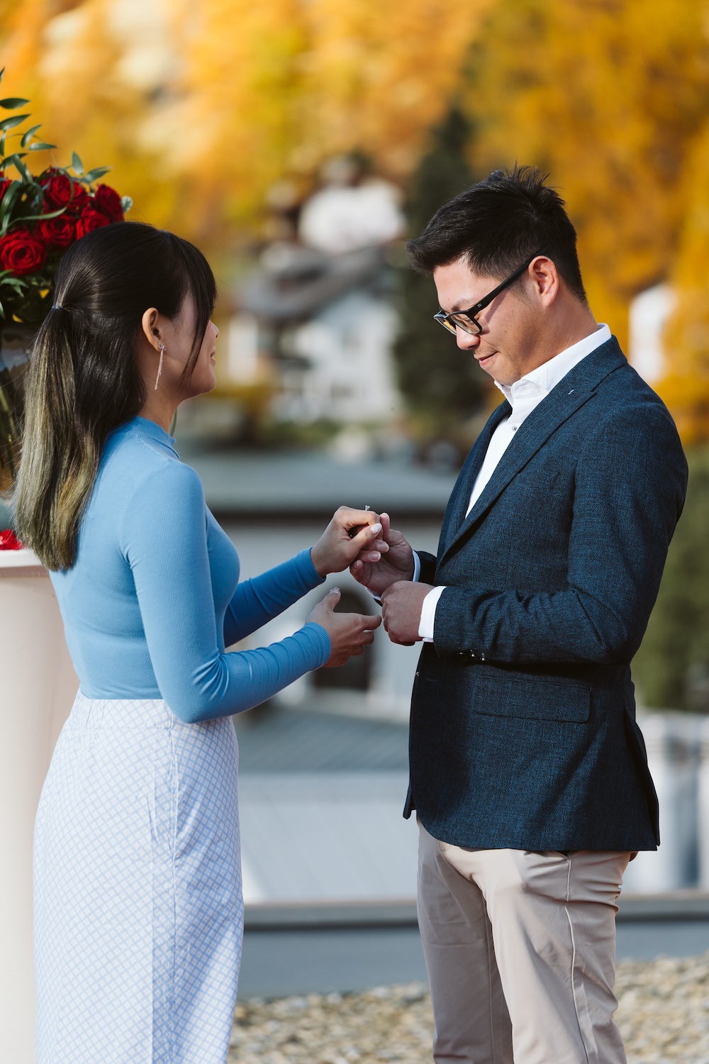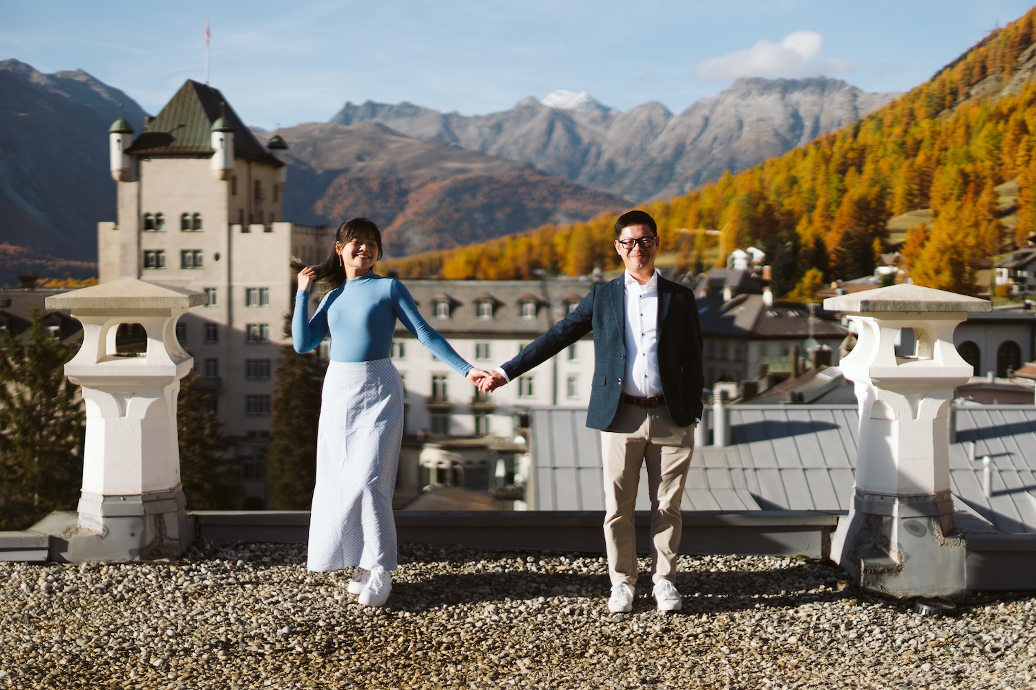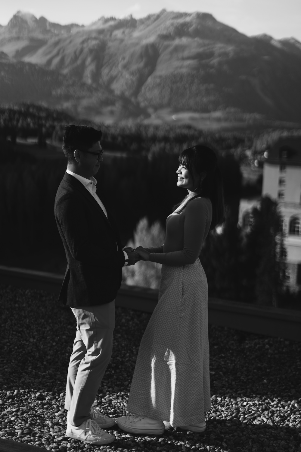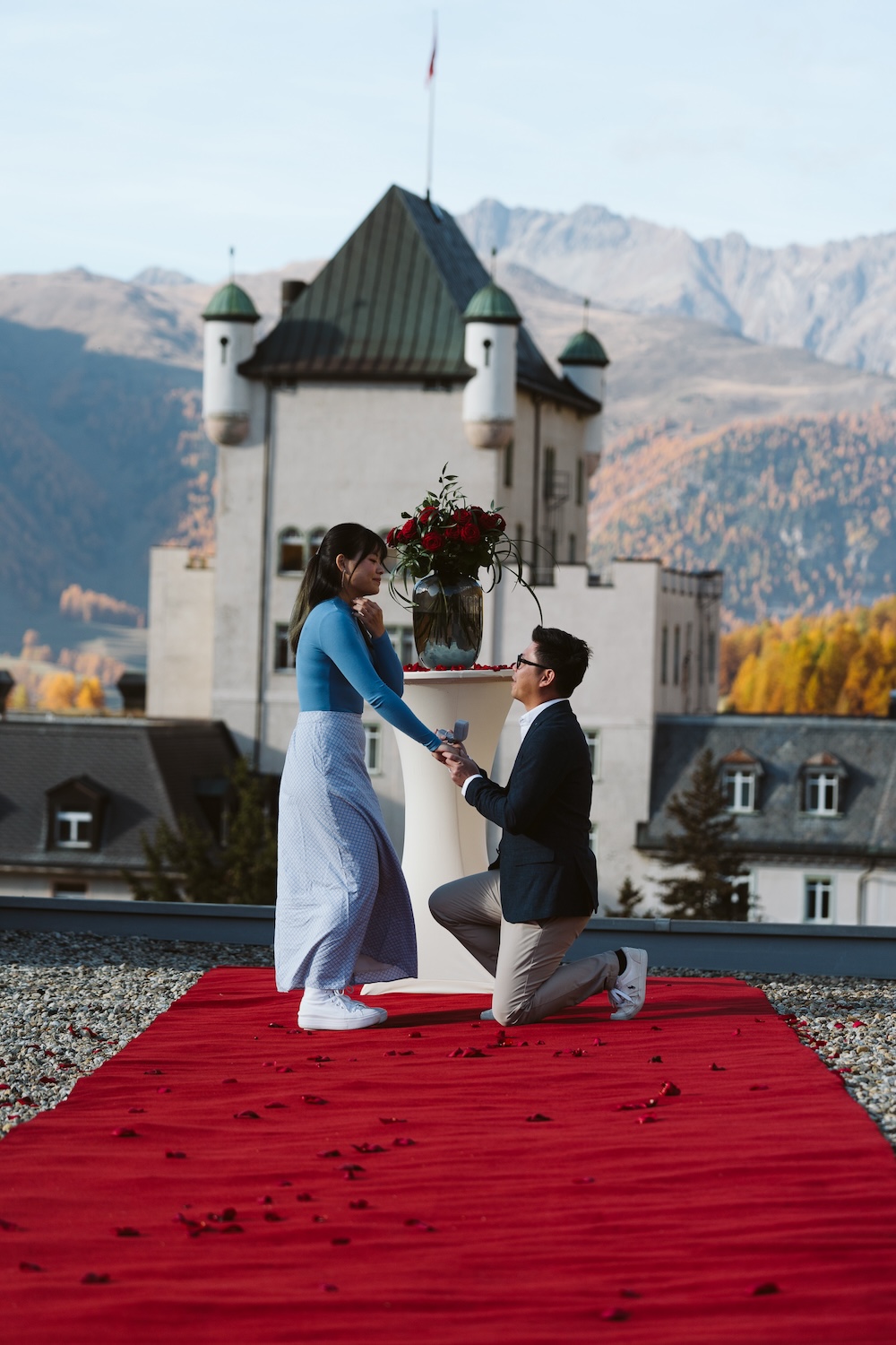 Gwee wanted a location that embodied elegance, intimacy, and breathtaking beauty, and he found it atop the Grand Hotel Kronenhof. With panoramic views of the surrounding mountains and valleys bathed in the golden glow of autumn, the rooftop was the perfect spot. The air was filled with a gentle anticipation as Joyce, unsuspecting, stepped out onto the rooftop, taking in the views.