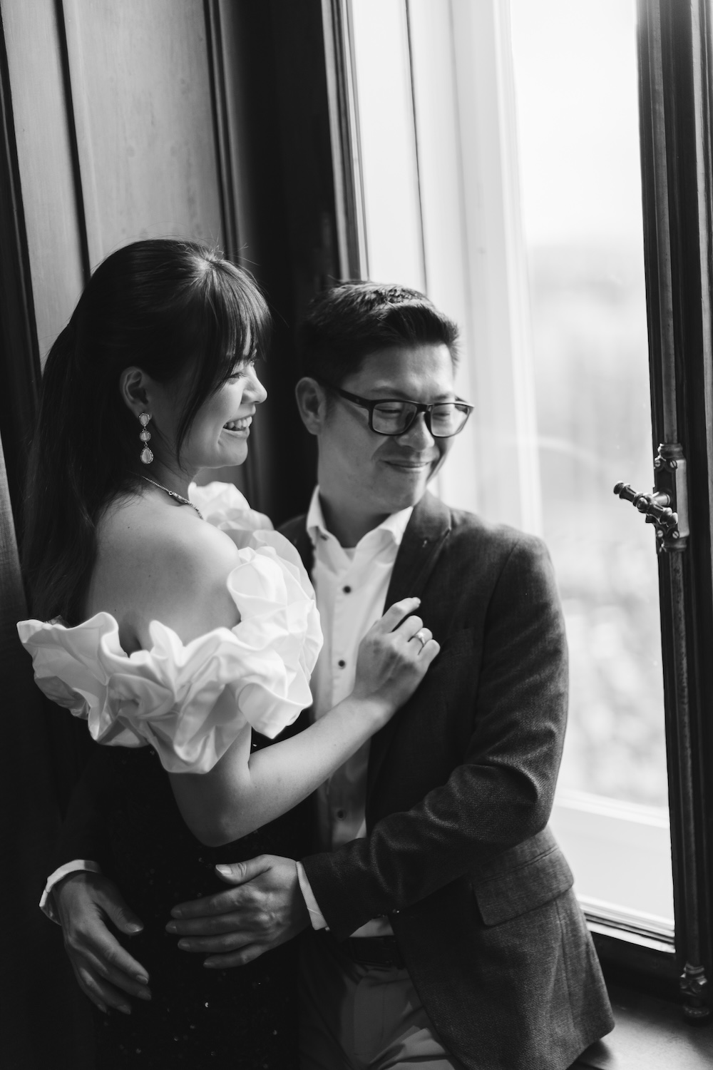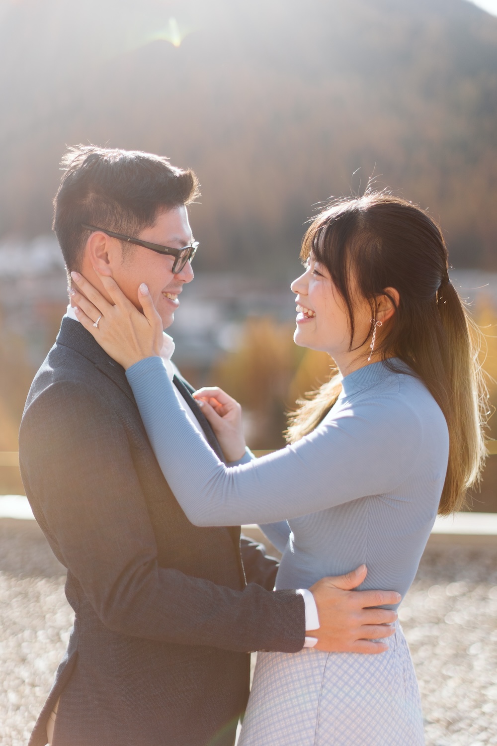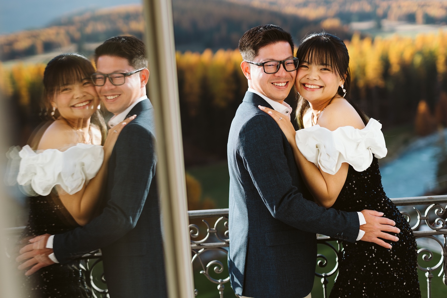 The session began in their suite, where the balcony offered a private view of the mesmerizing autumn landscape. Joyce and Gwee looked out over the valley, wrapped in the warmth of their shared moment. Their happiness radiated, and it was beautifully reflected in the serene, golden hues of the trees and mountains beyond.