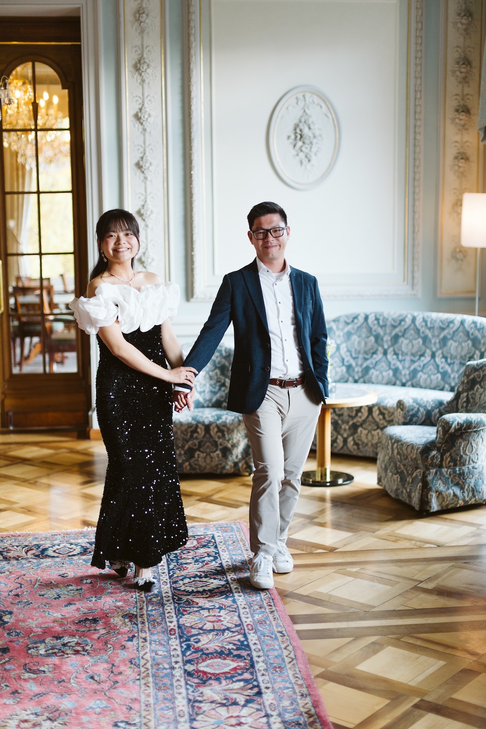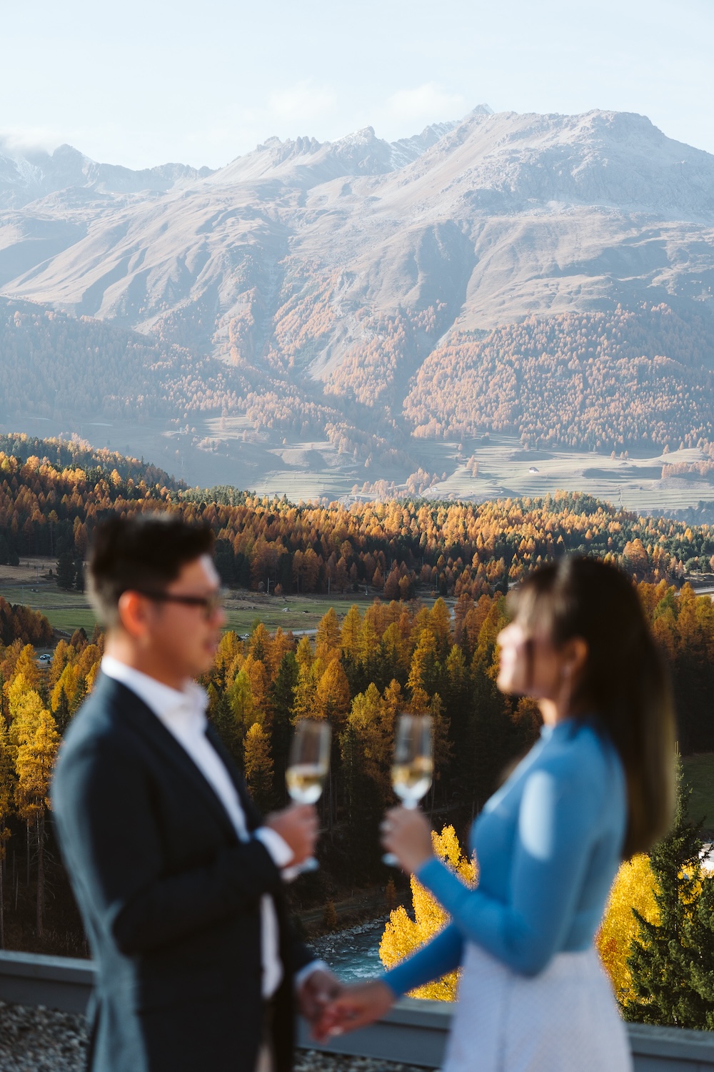 October in St. Moritz is truly magical. The golden hues of autumn blanket the Engadin Valley, and the air is crisp yet inviting. Against this vibrant backdrop, Gwee planned the ultimate surprise for the love of his life, Joyce. With help from the amazing staff at the Grand Hotel Kronenhof in Pontresina, Gwee orchestrated a proposal that Joyce would never forget.