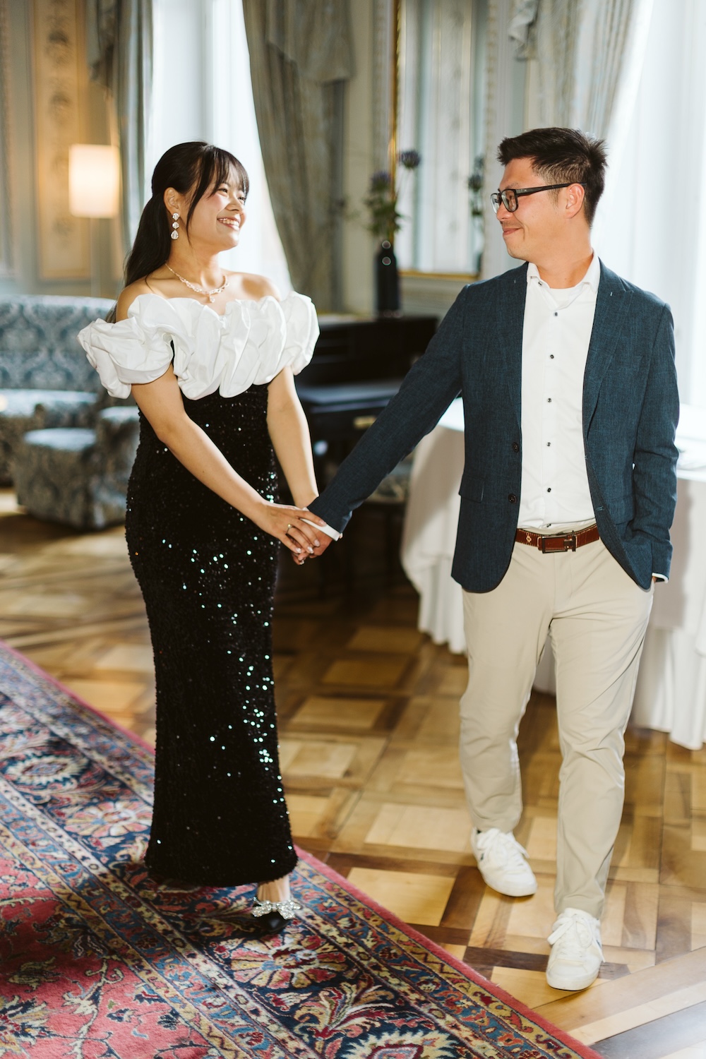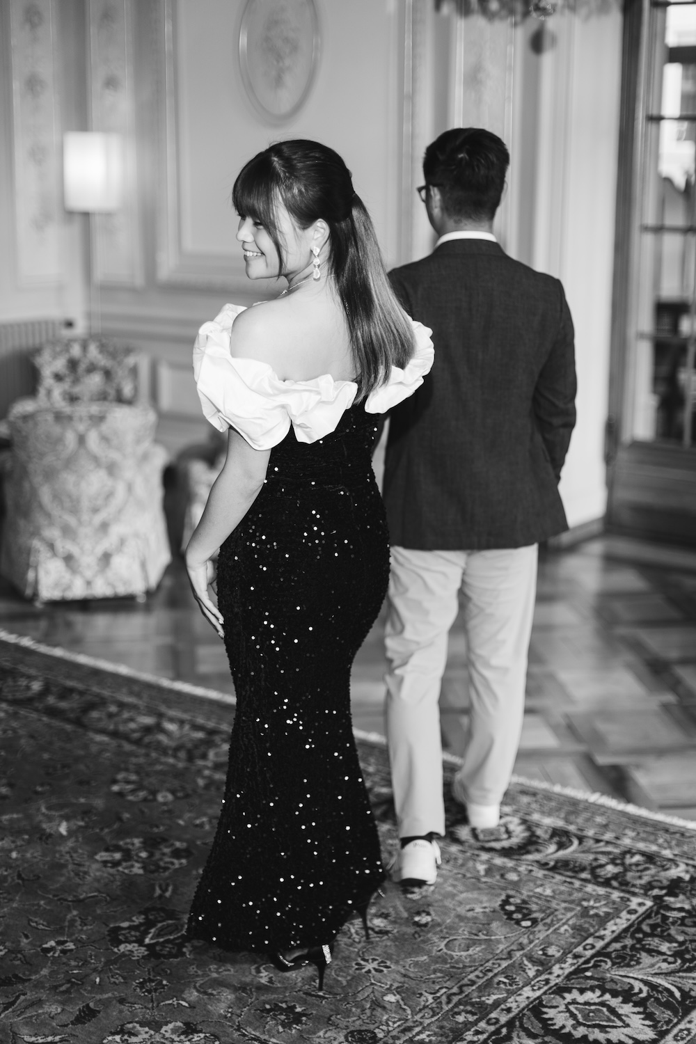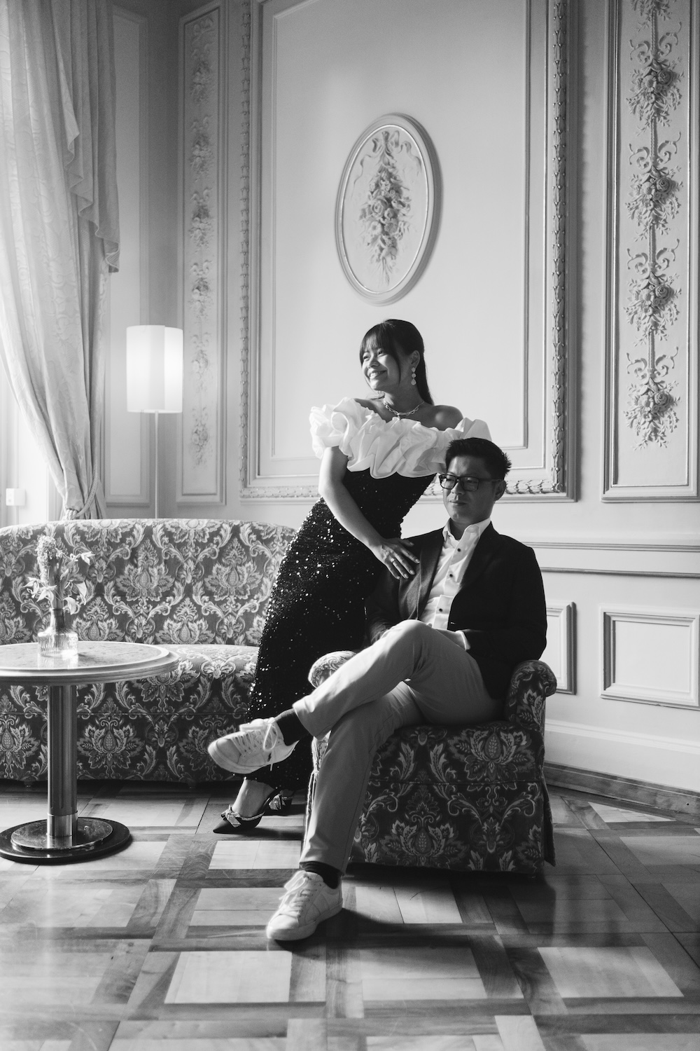 Next, they moved to Salon Bleu, an iconic room adorned with grand mirrors, opulent drapery, and intricate details. The grandeur of the room set a regal tone, adding elegance to every shot. The photos captured their connection perfectly—playful yet elegant, cheerful yet deeply heartfelt.