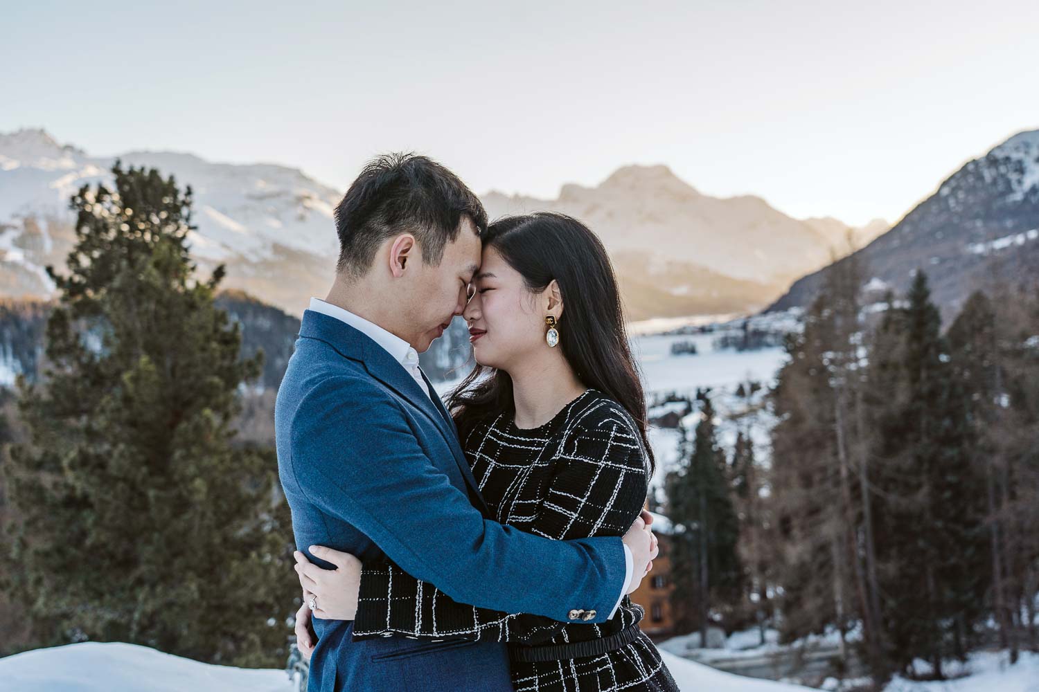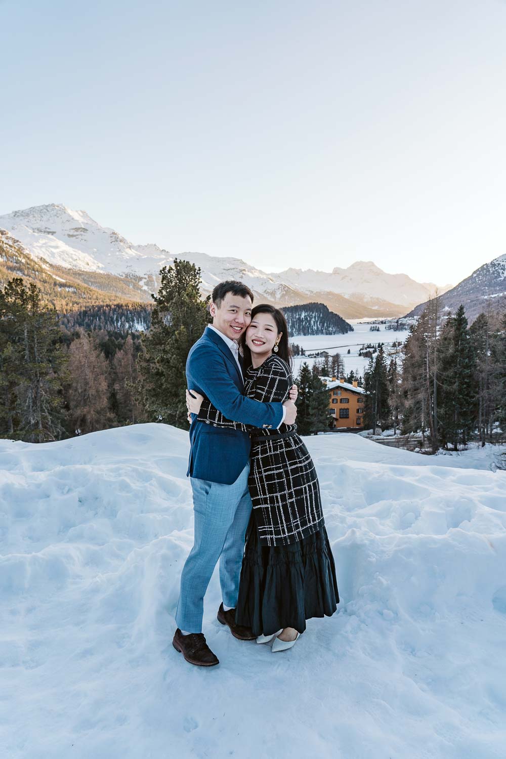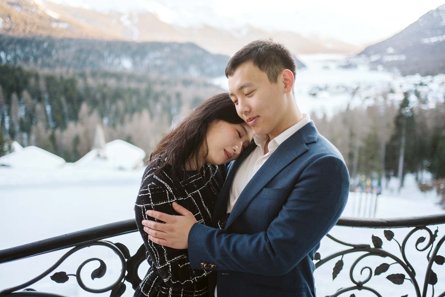 Following the joyous acceptance of the proposal, we capitalized on the breathtaking surroundings for a portrait session. The snow-covered garden, boasting panoramic views of the Swiss Alps, provided a stunning natural backdrop. Against the serene white canvas, Bill and Cindy’s love radiated, creating timeless portraits that will forever encapsulate the magic of that winter day.
