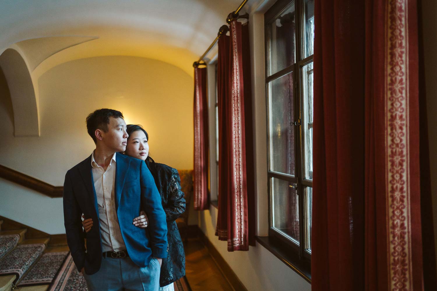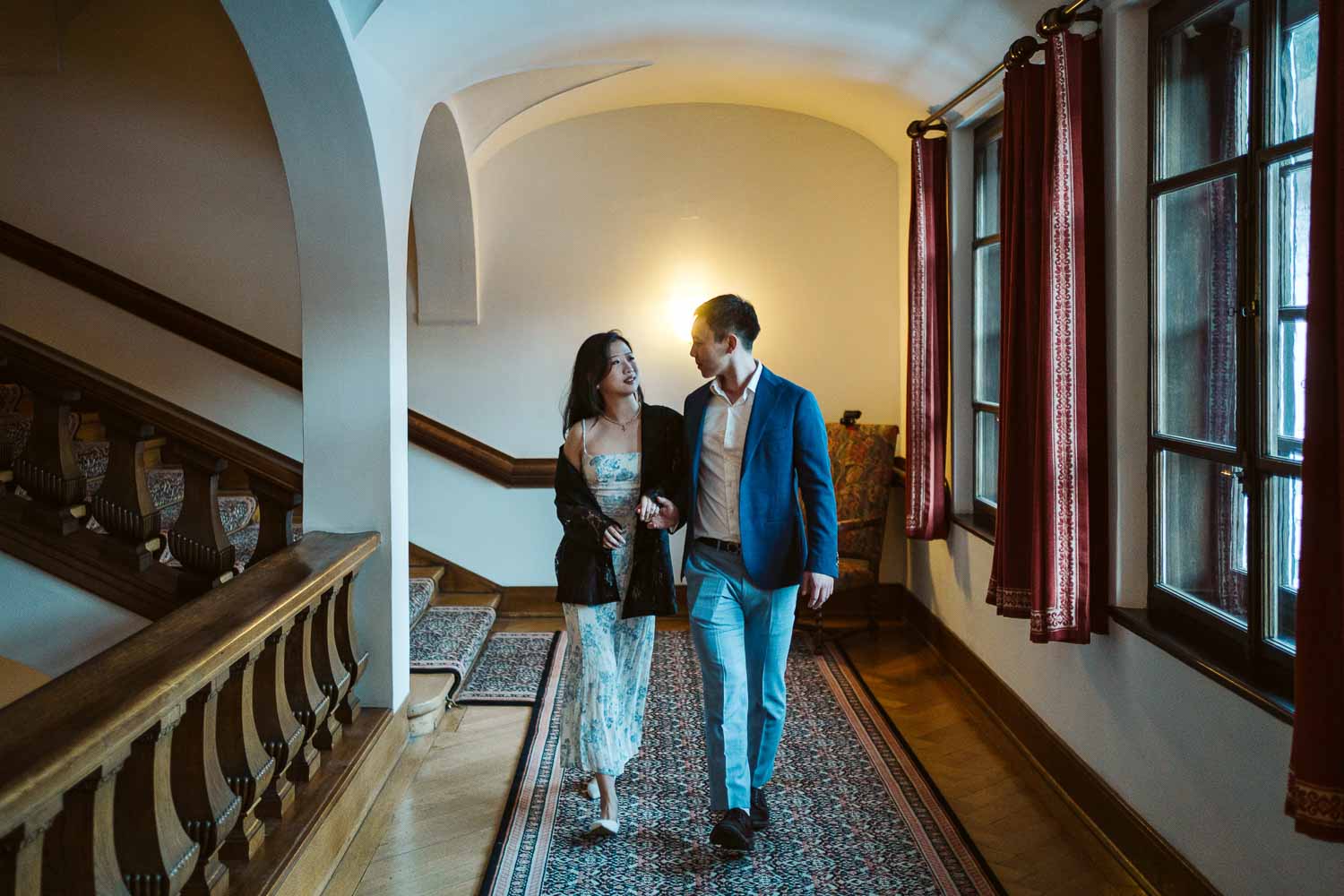 The journey continued within the opulent halls of Suvretta House. We ventured to the balcony of their suite, the intricate wooden stairs, the bustling lobby, and the front of the unique lift. Each location offered a different aesthetic, providing a diverse collection of images that showcased the couple’s love story against the backdrop of the hotel’s unparalleled luxury.